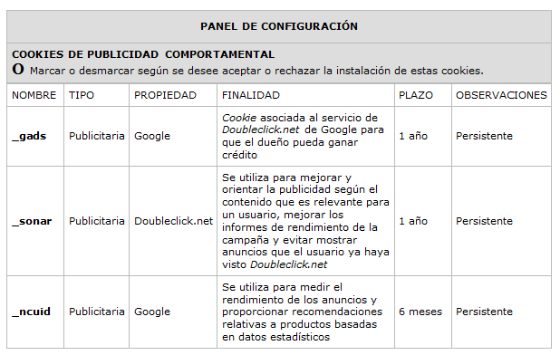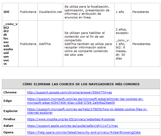COOKIES UTILIZADAS EN ESTE SITIO WEB